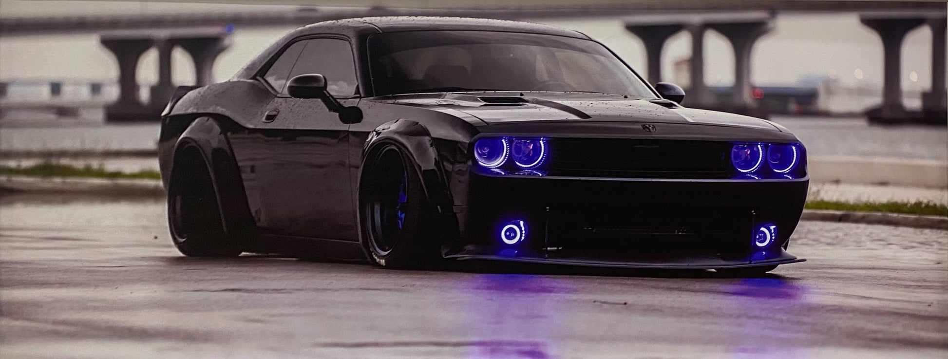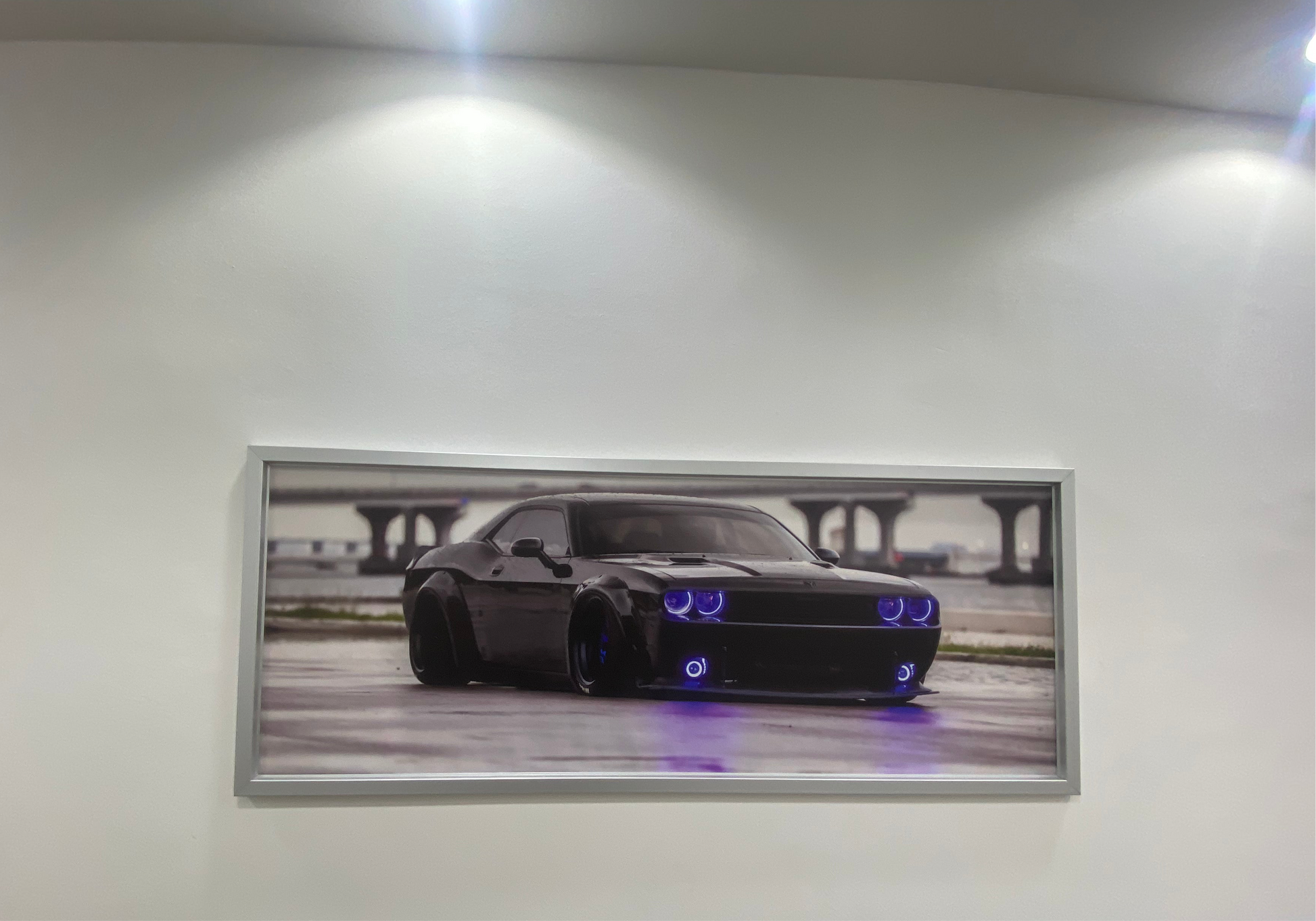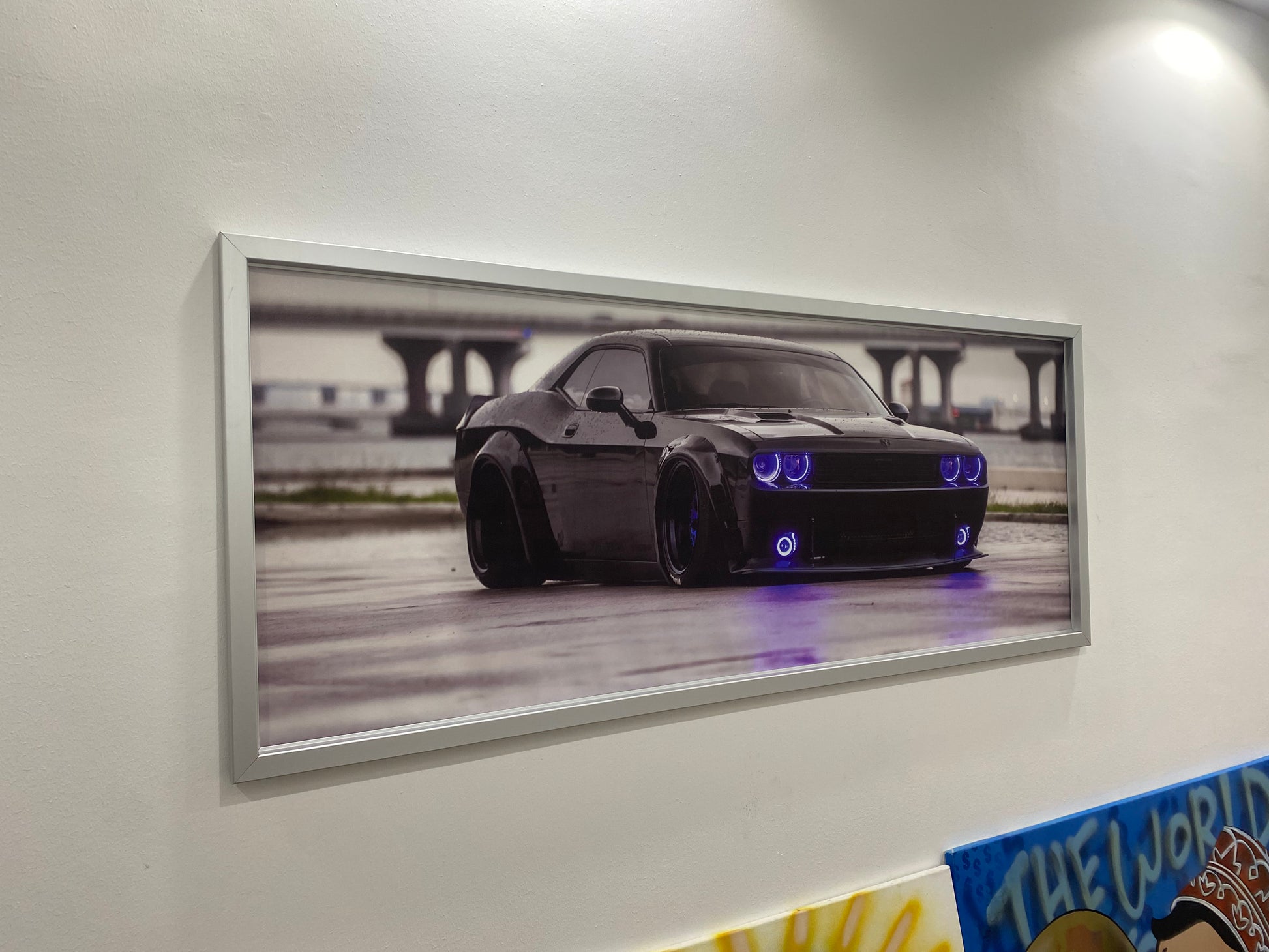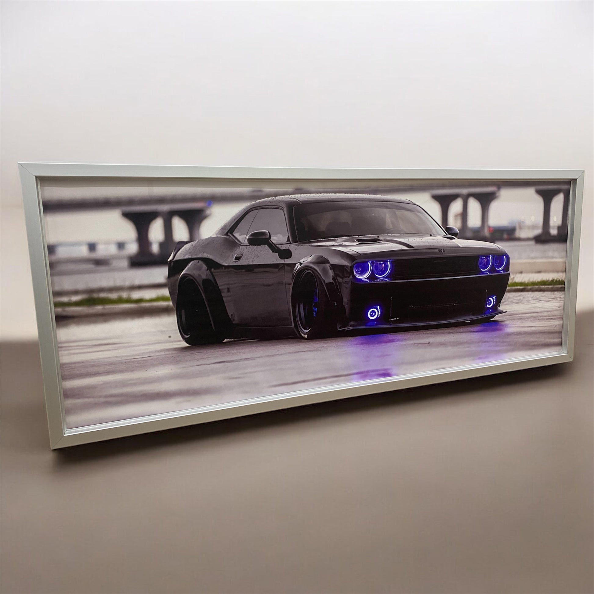 أضف لمسةً مميزةً إلى مساحتك مع هذه اللوحة الجدارية الرائعة المؤطرة، والتي تُظهر سيارة دودج تشالنجر سوداء اللون في أجواء حضرية أنيقة وممطرة. تُظهر هذه المطبوعة عالية الجودة مظهر السيارة العريض الجريء، وتعديلاتها المُخصصة، وأضواء النيون الزرقاء الجذابة ، مما يجعلها قطعةً أساسيةً لعشاق السيارات ومُحبي الديكور العصري.